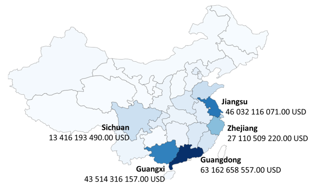 Figura 2: Provincias chinas con mayor volumen de comercio en el 2025 con Vietnam en dólares (USD)
