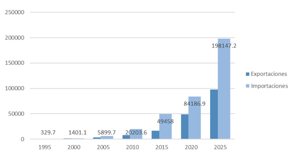 Figura 1: Comercio bilateral Vietnam-China en millones de dólares (MMUSD) 1995-2025.